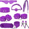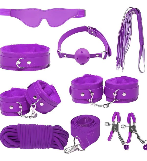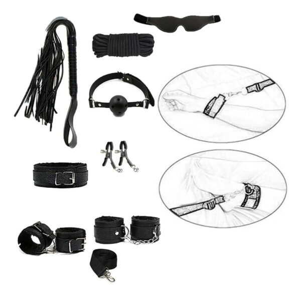 Kit Sado 8 Piezas Esposas Latigo Antifaz Mordaza Pinzas Soga
